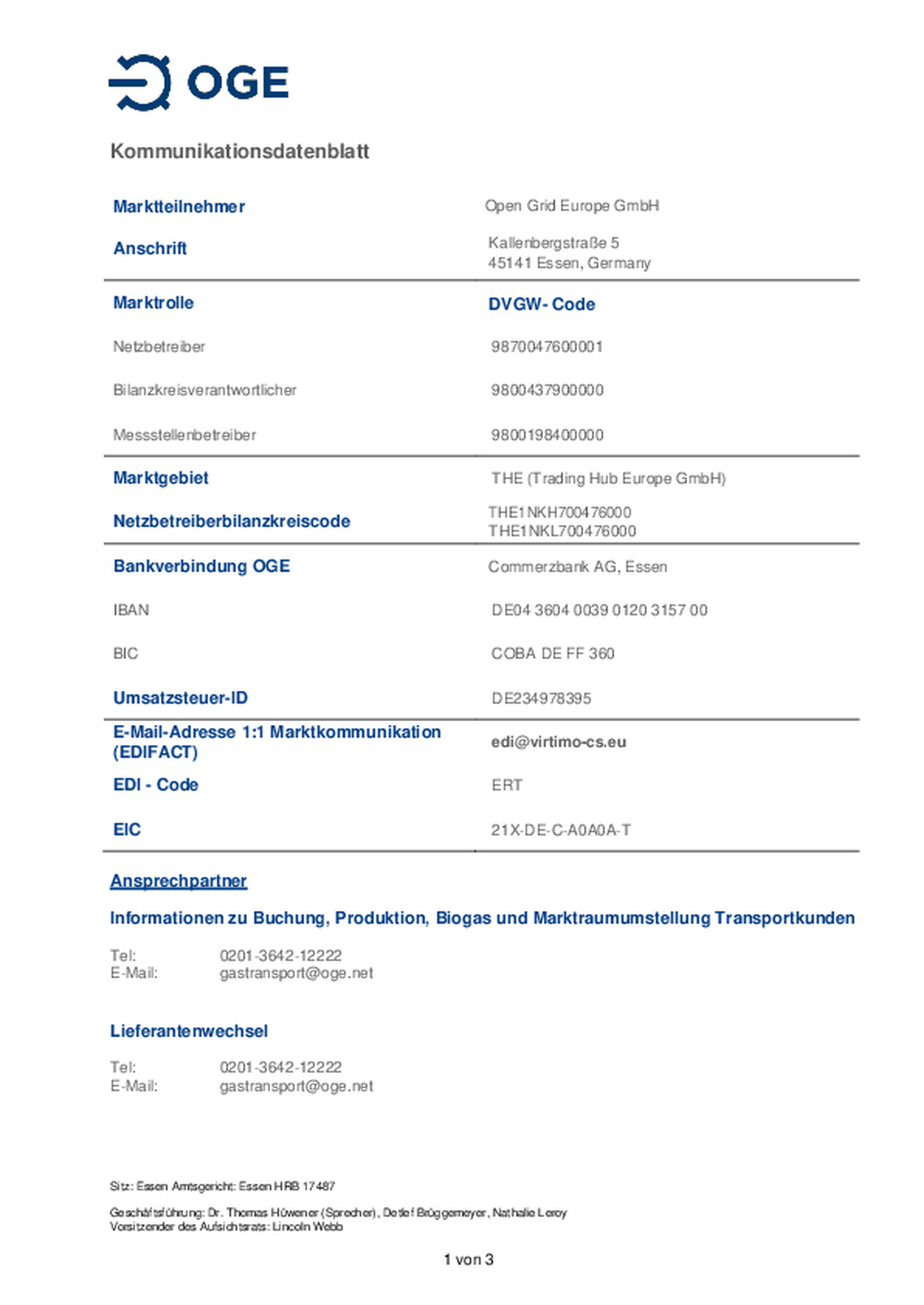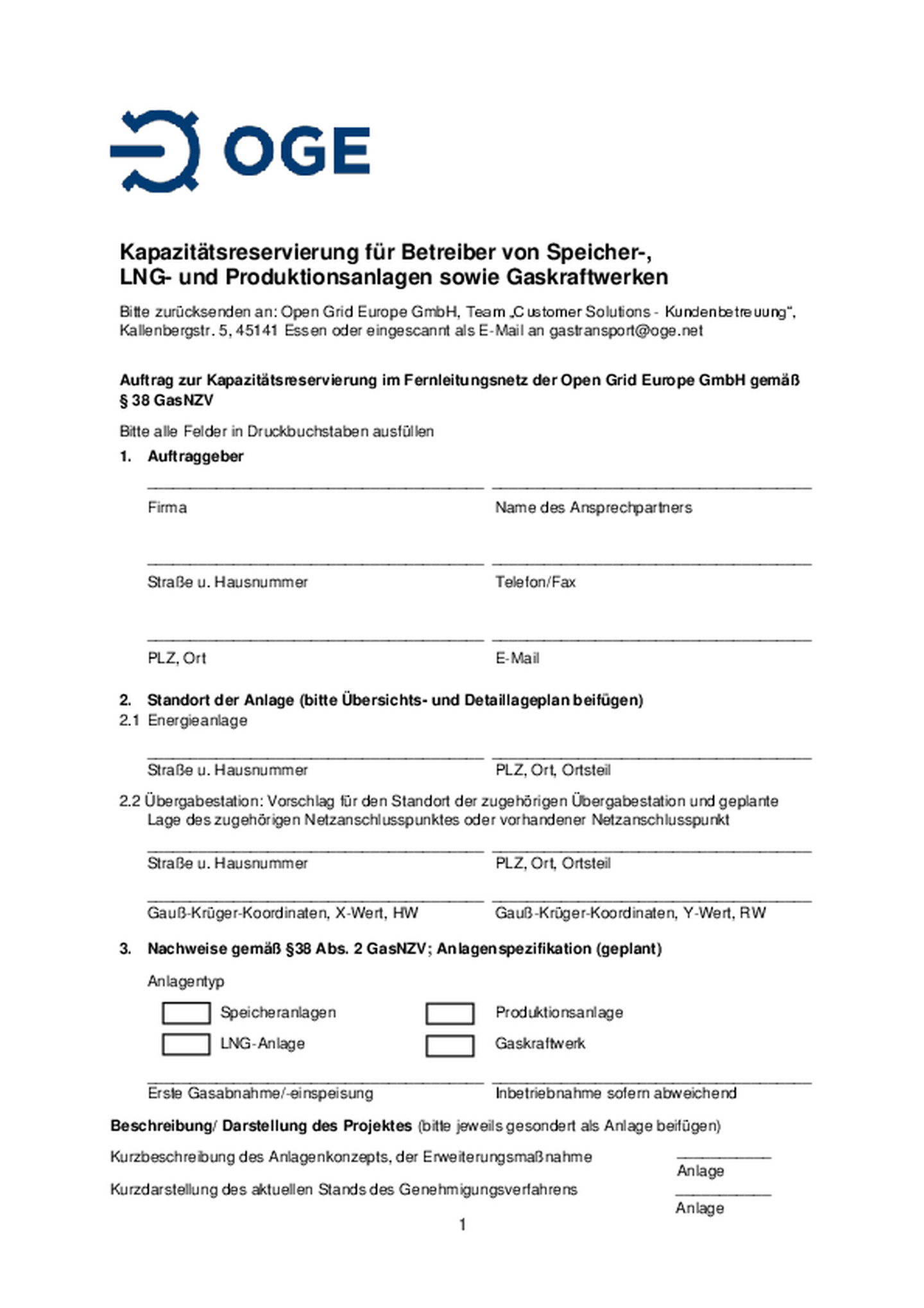 Open Grid Europe bietet seinen Transportkunden ein Formular zur effizienten Abwicklung von Anfragen nach § 38 GasNZV an. Durch die Verwendung des Formulars soll sichergestellt werden, dass Open Grid …Europe zeitnah über sämtliche Informationen verfügt, die für eine zügige Bearbeitung Ihrer Anfrage benötigt werden.
