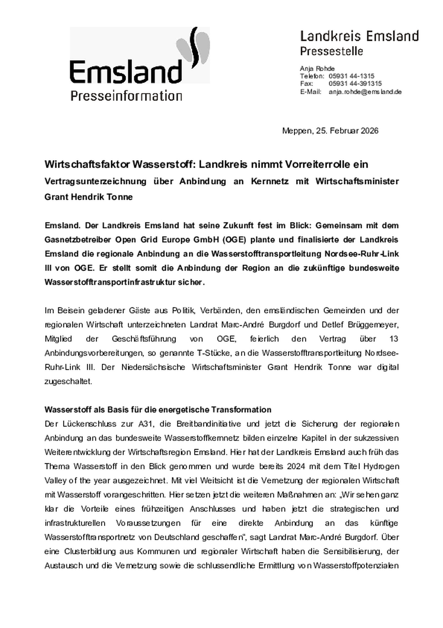 Vertragsunterzeichnung über Anbindung an Kernnetz mit Wirtschaftsminister Grant Hendrik Tonne