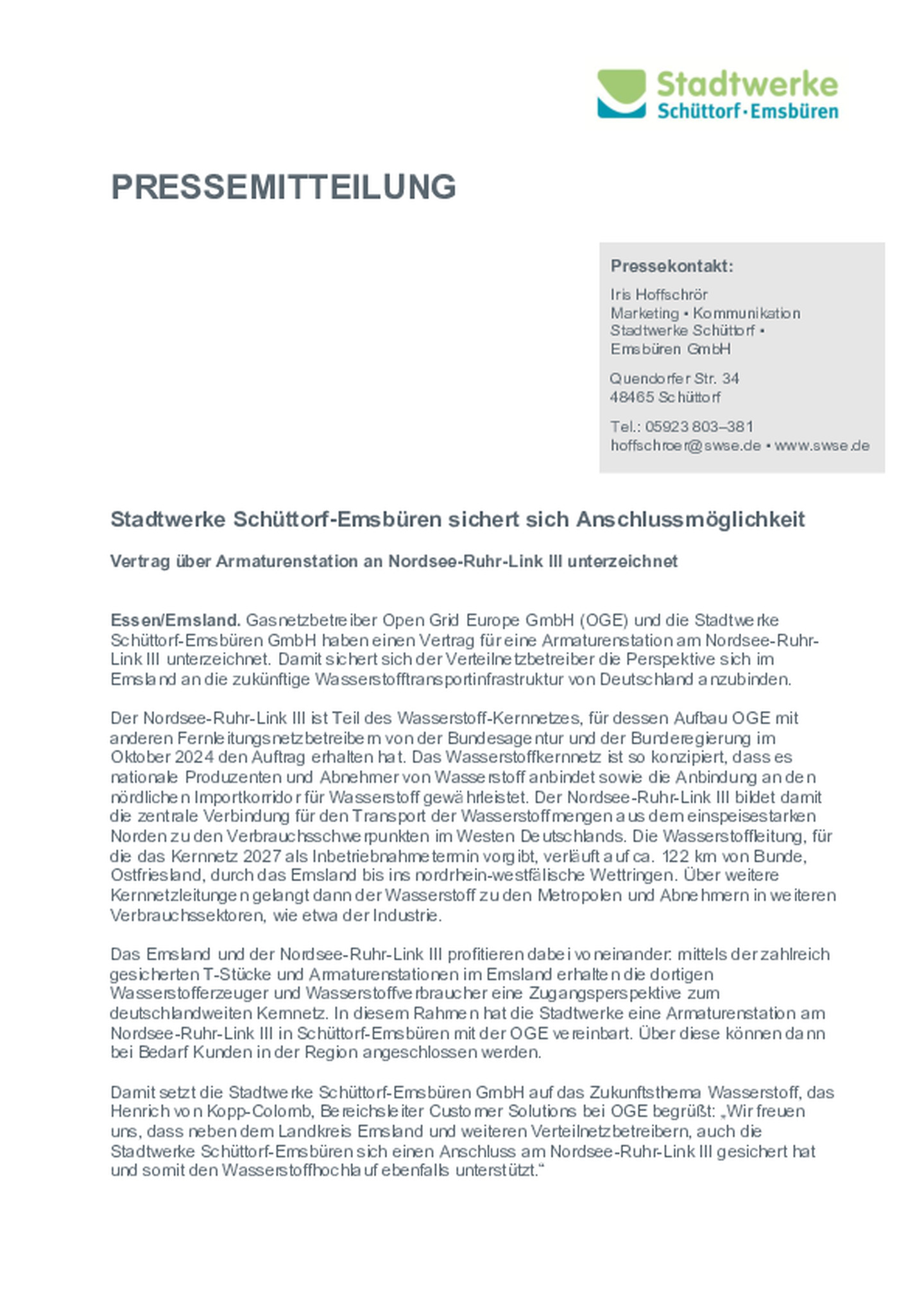 Stadtwerke Schüttorf-Emsbüren sichert sich Anschlussmöglichkeit