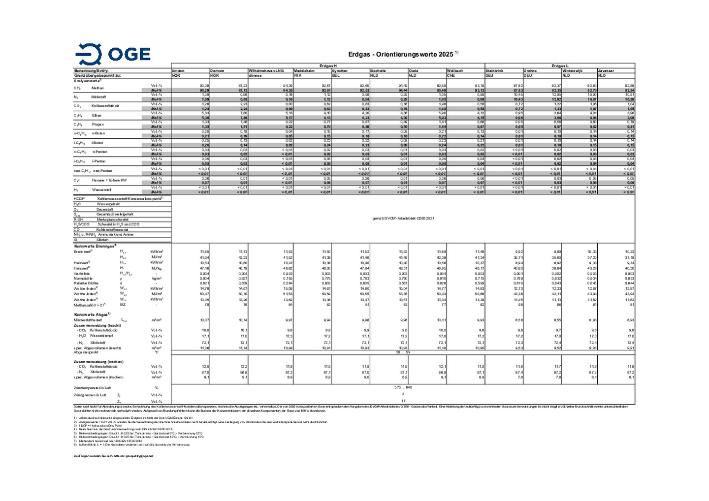 Erdgas Orientierungswerte der OGE