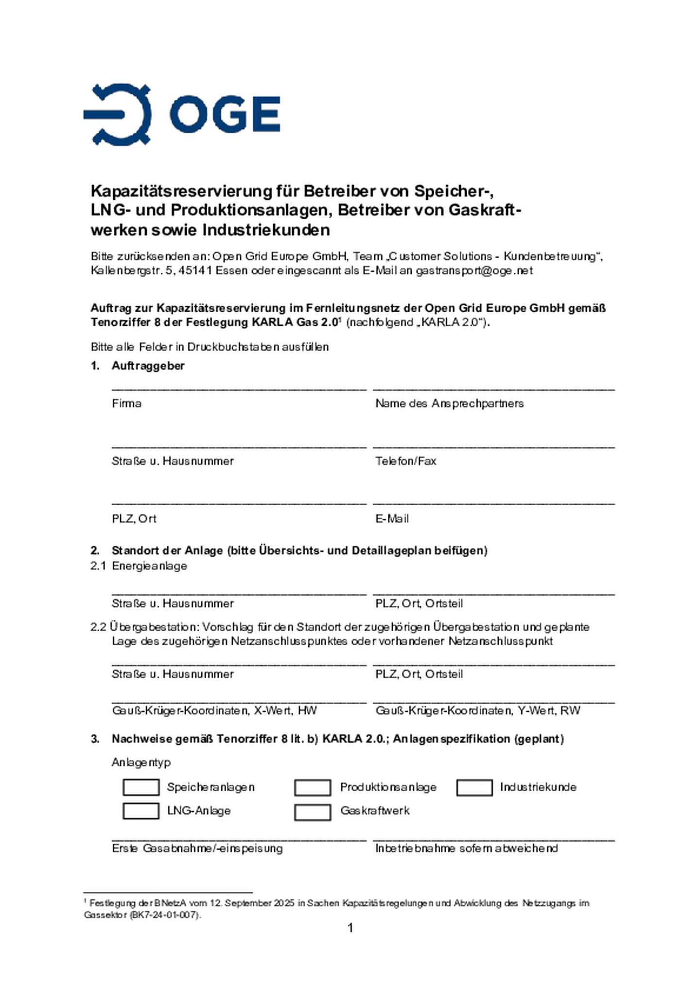 Open Grid Europe bietet seinen Transportkunden ein Formular zur effizienten Abwicklung von Anfragen gem. Tenorziffer 8 der Festlegung KARLA Gas 2.0 an. Durch die Verwendung des Formulars soll …sichergestellt werden, dass Open Grid Europe zeitnah über sämtliche Informationen verfügt, die für eine zügige Bearbeitung Ihrer Anfrage benötigt werden.