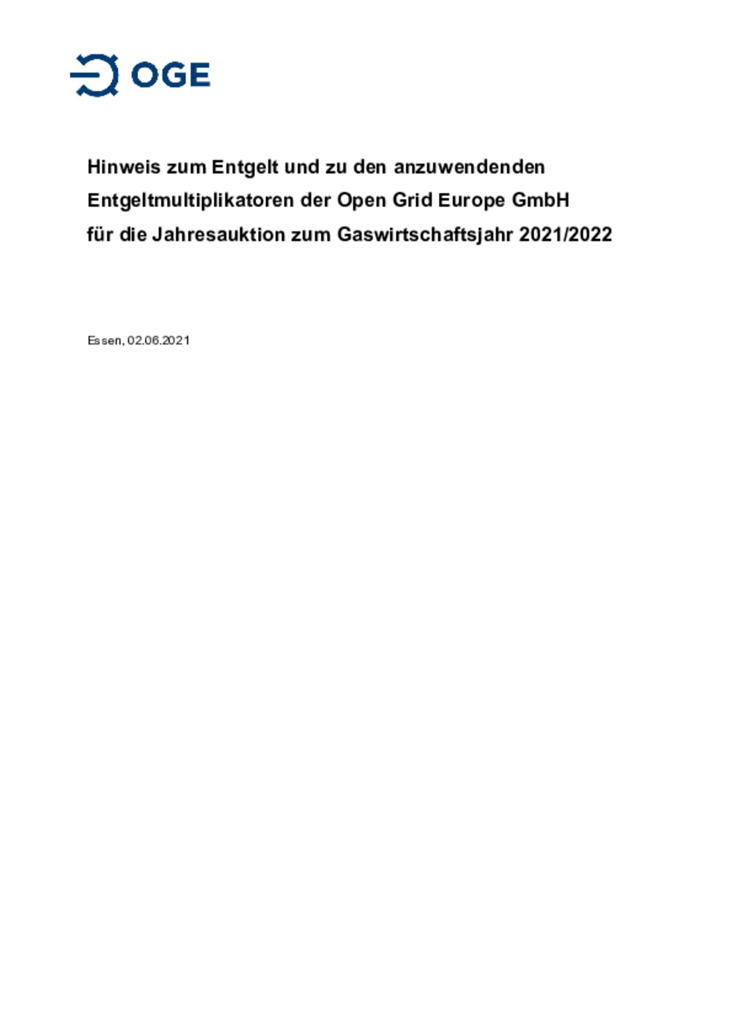 Hinweisblatt zum Entgelt und den anzuwendenden Entgeltmultiplikatoren der Open Grid Europe GmbH