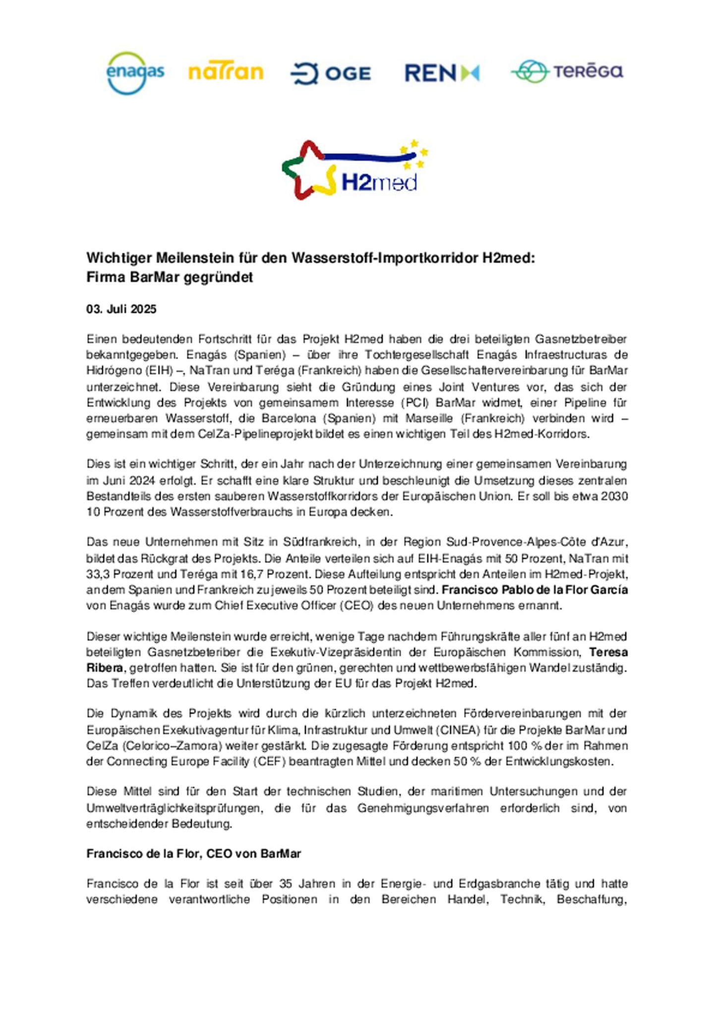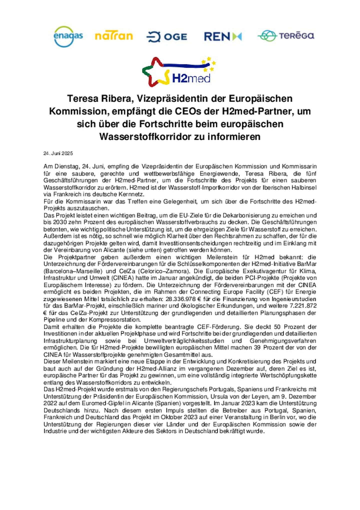 Am Dienstag, 24. Juni, empfing die Vizepräsidentin der Europäischen Kommission und Kommissarin für eine saubere, gerechte und wettbewerbsfähige Energiewende, Teresa Ribera, die fünf …Geschäftsführungen der H2med-Partner, um die Fortschritte des Projekts für einen sauberen Wasserstoffkorridor zu erörtern. H2med ist der Wasserstoff-Importkorridor von der Iberischen Halbinsel via Frankreich ins deutsche Kernnetz.