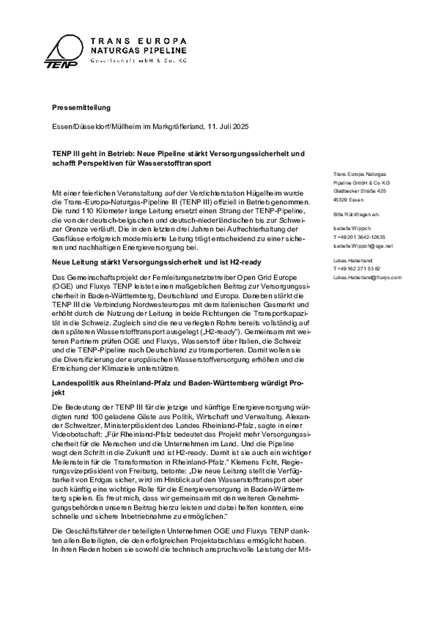 Pressefoto: TENP III geht in Betrieb