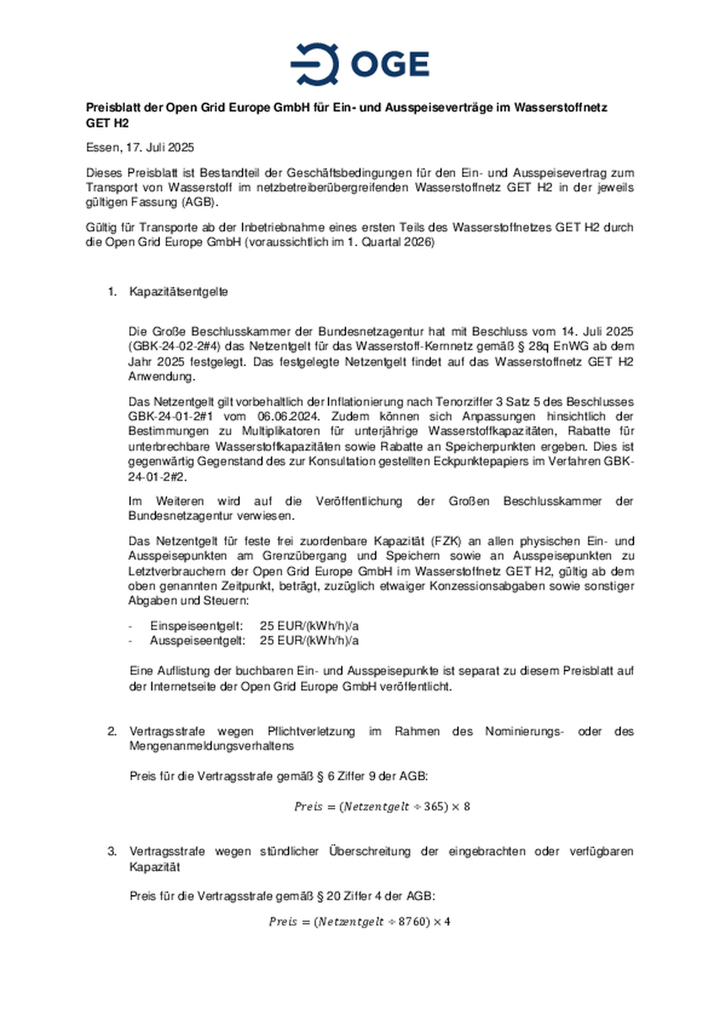 Preisblatt, Netzzugang Wasserstoff / pdf / 378.48 KB