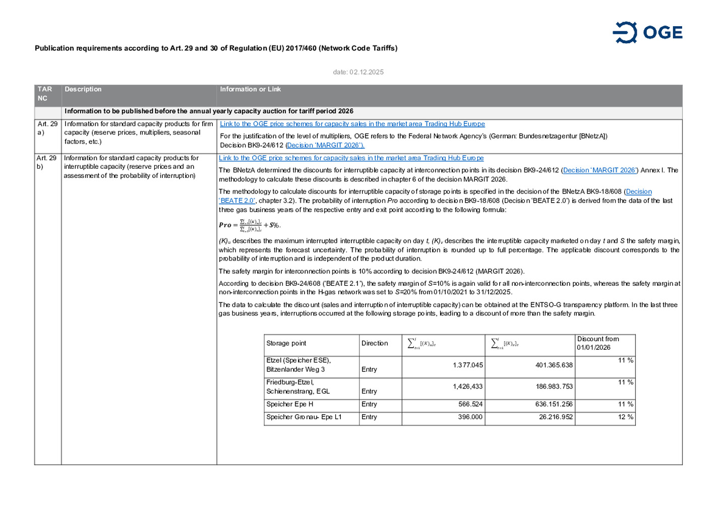 Publication by Open Grid Europe GmbH according to the network code on harmonised transmission tariff structures (Regulation (EU) 2017/460)
