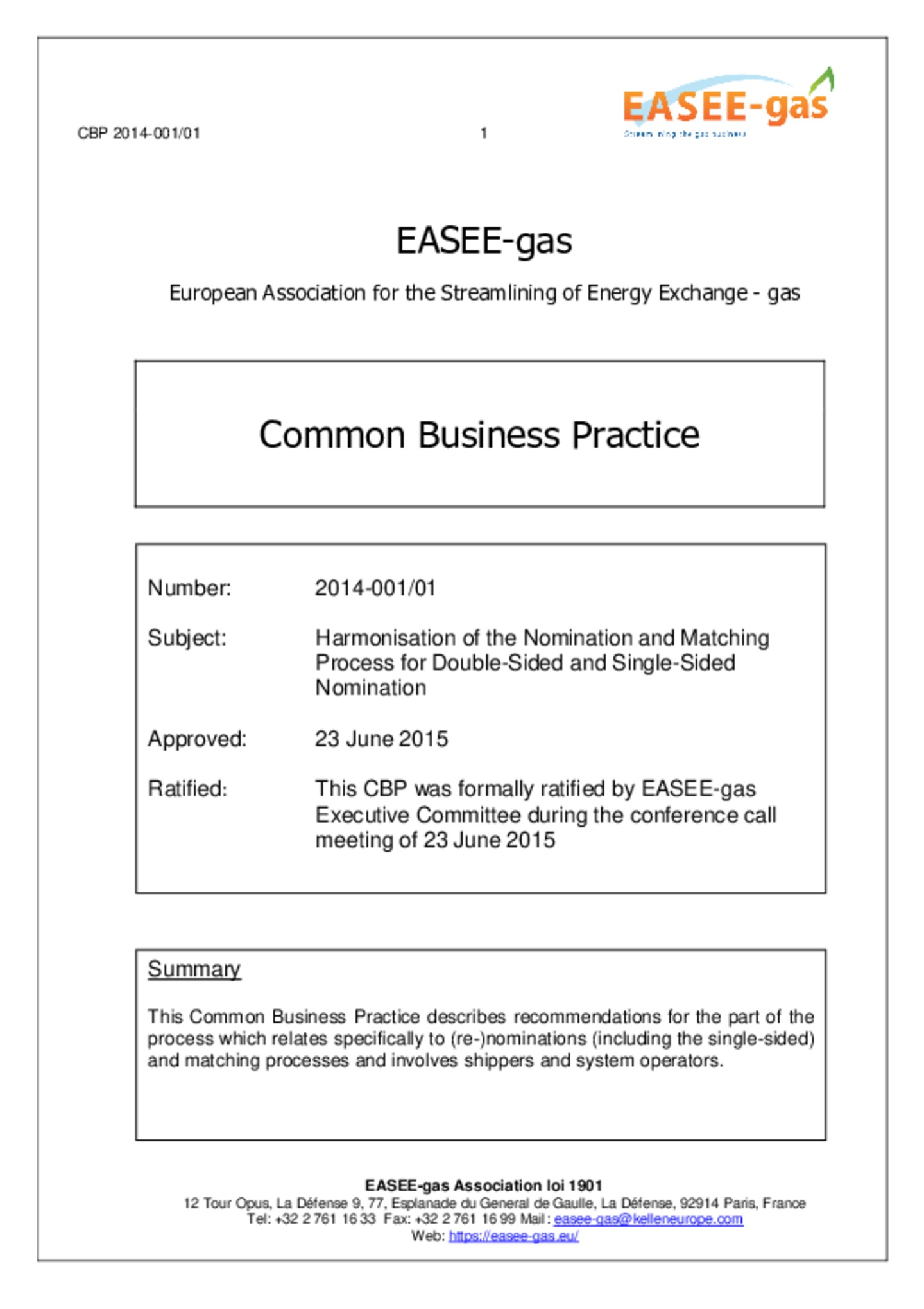 CBP (2014-001/01): Harmonisation of the Nomination and Matching Process for Double-Sided and Single-Sided Nomination: The following Common Business Practice (CBP) has been approved by EASEE-gas for …use in gas business transactions across connection points and constitutes recommendations for the part of the process which relates specifically to (re-)nominations and involves shippers on one hand, and system operators on the other hand. This CBP reflects minimum requirements in line with the network codes in the areas referred to in Article 8(6) of the Regulation (EC) 715/20091. This CBP does not exclude additional provisions between individual parties