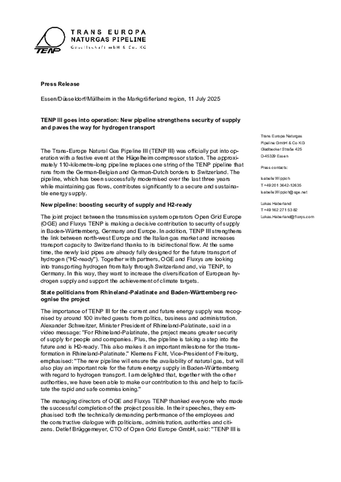 This price sheet is part of the General Terms and Conditions for Entry/Exit Contracts Governing the Transportation of Hydrogen in the GET H2 Network of Multiple Network Operators in the currently …valid version (GTC). Valid for hydrogen transports from commissioning of the first part of the GET H2 Network of Open Grid Europe GmbH (expected in Q1 2026). Status 17 July 2025