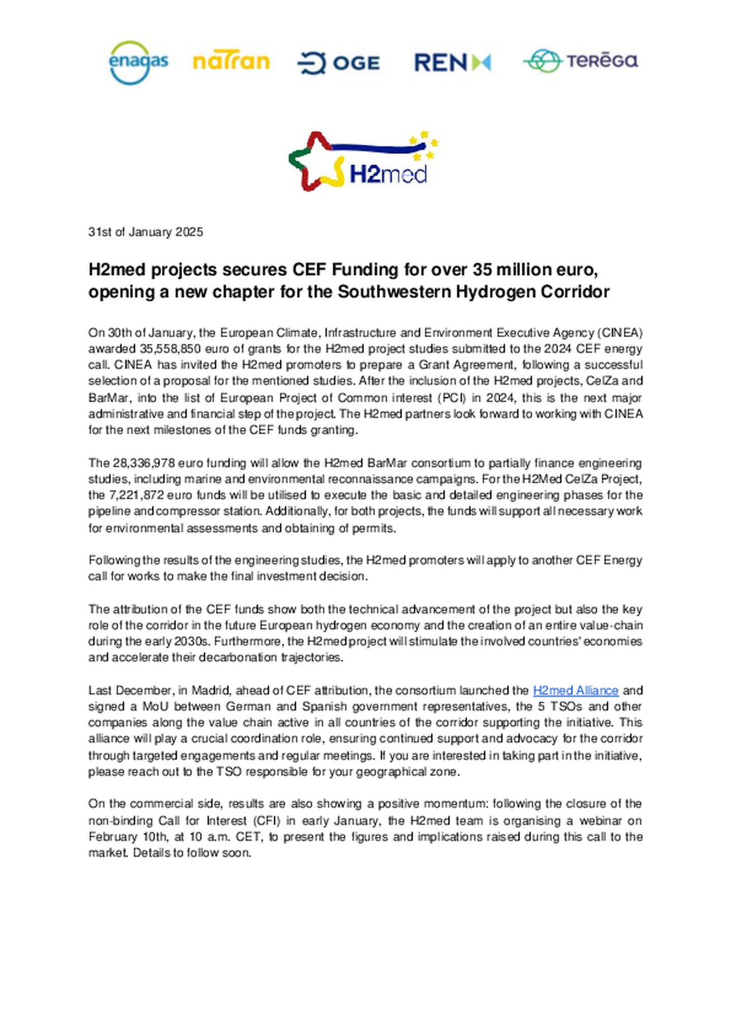 H2med projects secures CEF Funding for over 35 million euro, opening a new chapter for the Southwestern Hydrogen Corridor
